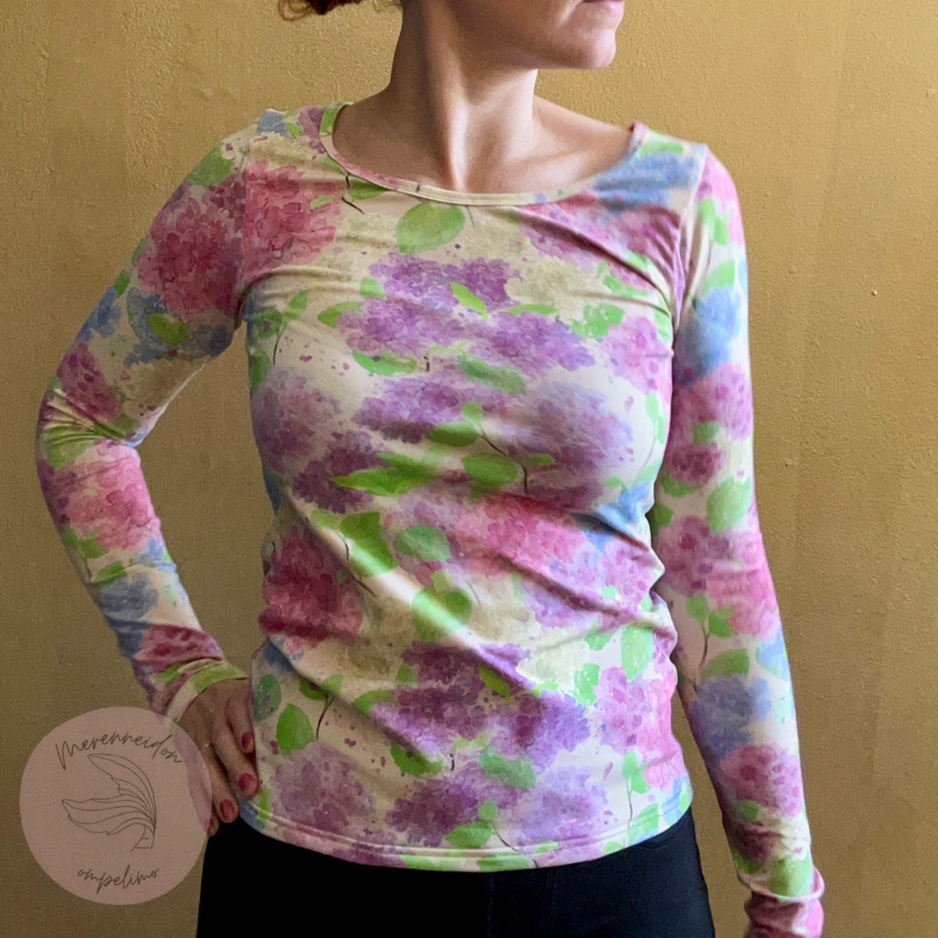 Mukava, jokapäiväiseen käyttöön sopiva trikoopaita pitkillä hihoilla. Materiaaliksi sopivat joustavat materiaalit, kuten trikoo, ribbitrikoo tai viskoositrikoo.