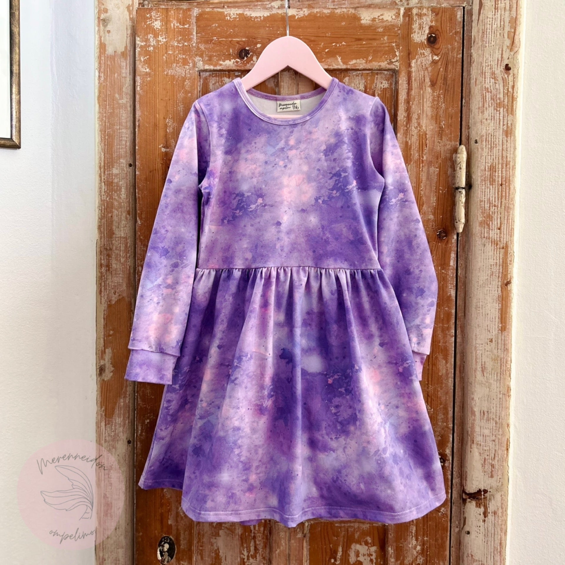 Amanda-mekko Merenneidon omasta Hattarapilvi-kuosista pitkillä hihoilla arkeen ja juhlaan. Koko 116 cm.