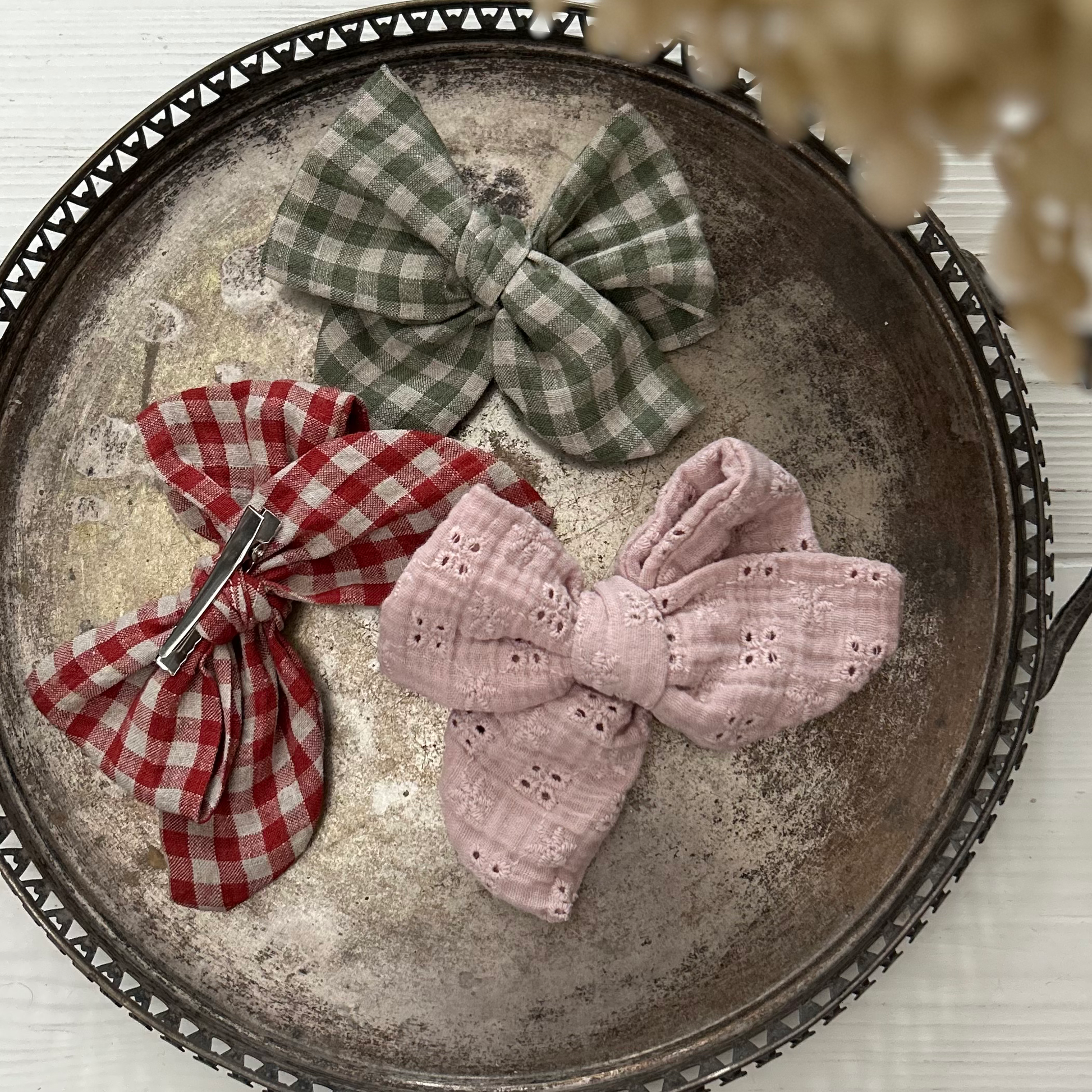 Näyttävät, isommat Malla-rusetit juhlakampaukseen tai arkea ilahduttamaan. Metallinen klipsikiinnitys.