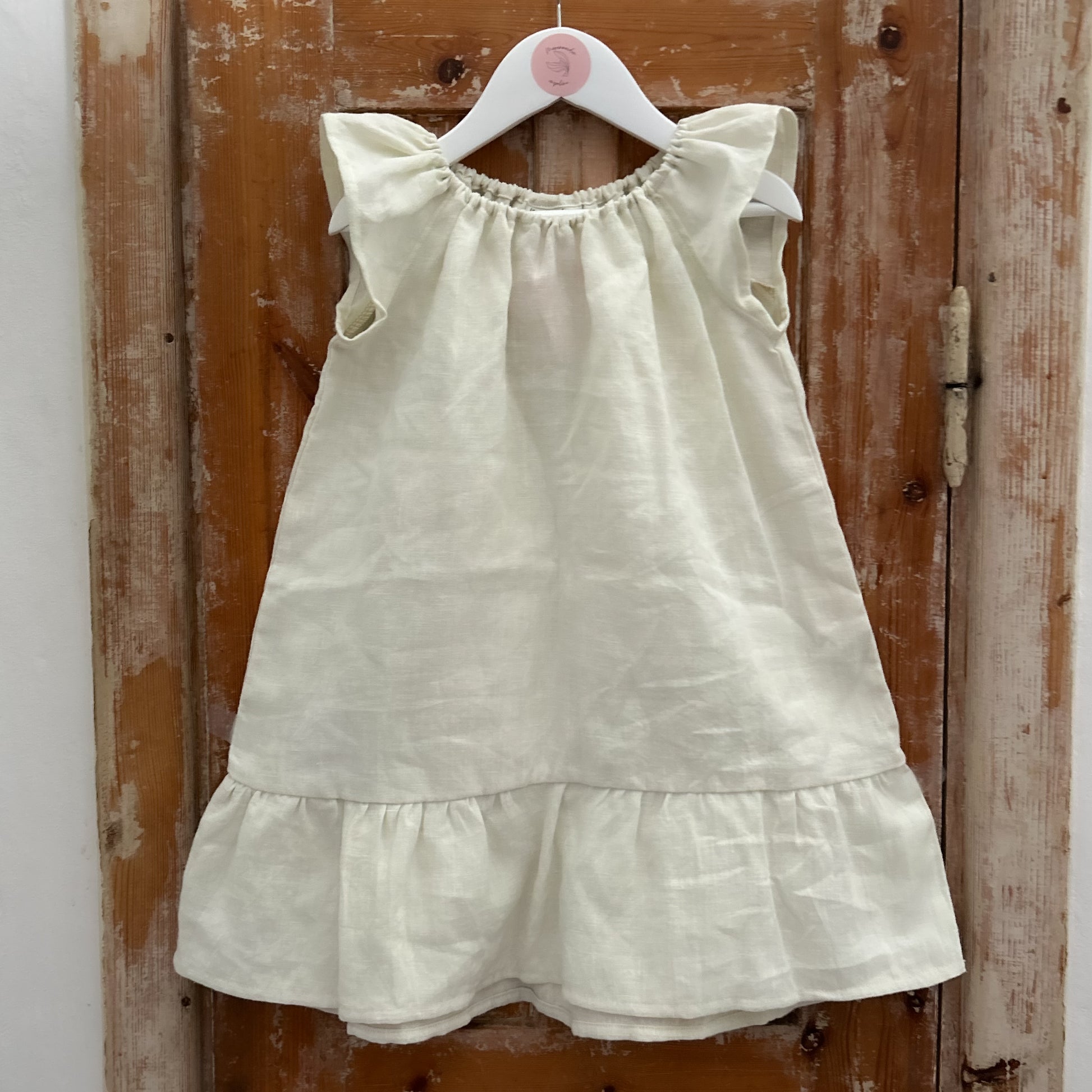 Keveä, lyhythihainen Minttu-mekko luonnonvalkoisesta pellavasta. Koko 98/104 cm.
