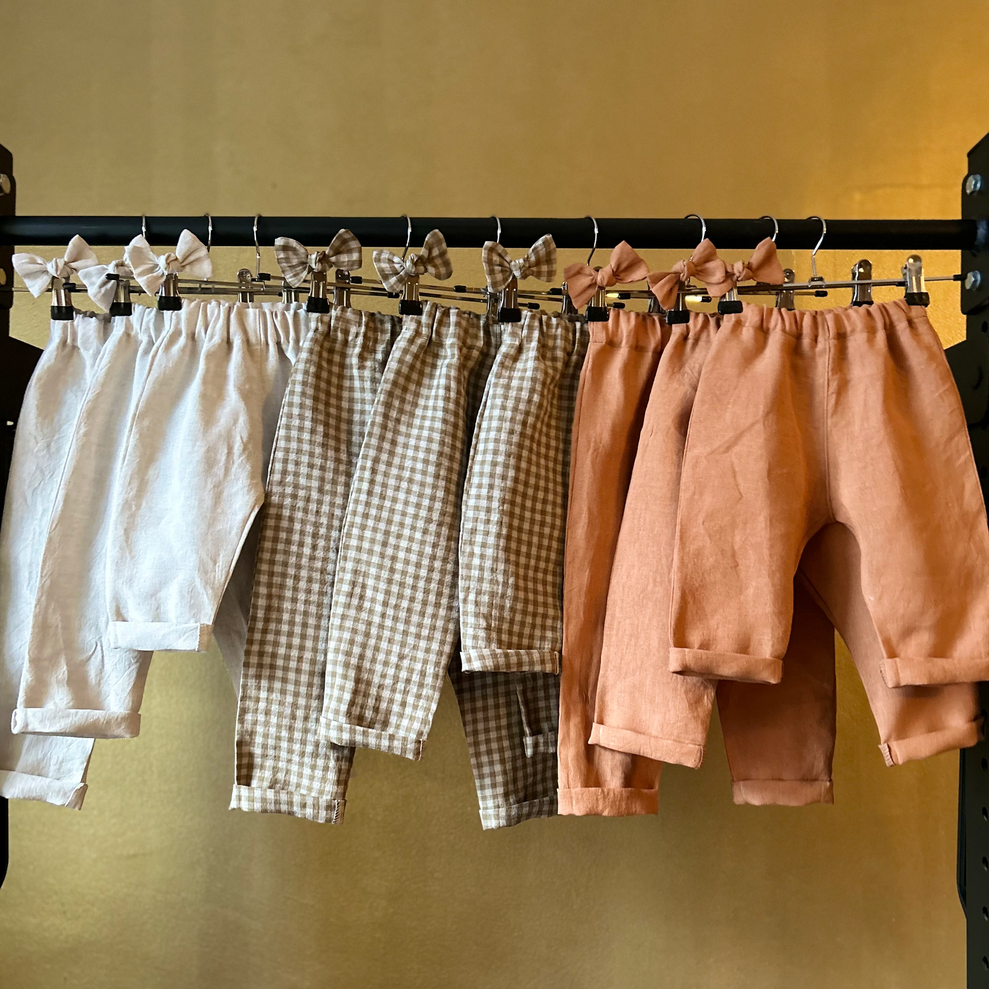 Keveät ja monikäyttöiset pellavahousut pitkillä lahkeilla ja kuminauhavyötäröllä.