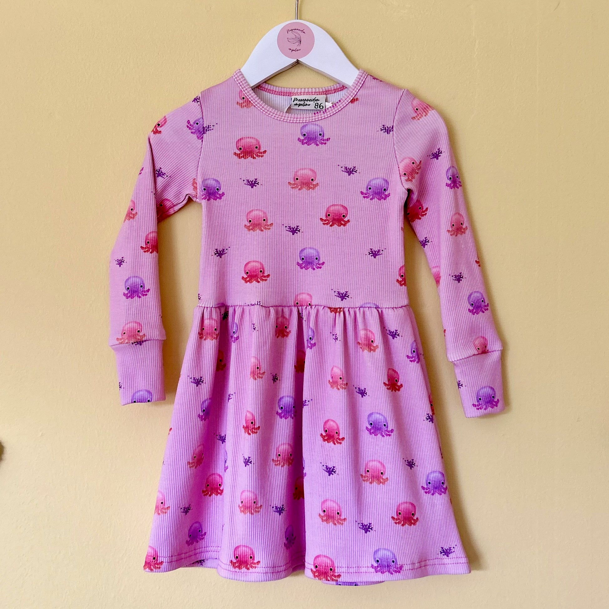 Soma ribbimekko Merenneidon omasta Vauvatursaat-kuosista pitkillä hihoilla. Koko 86 cm.