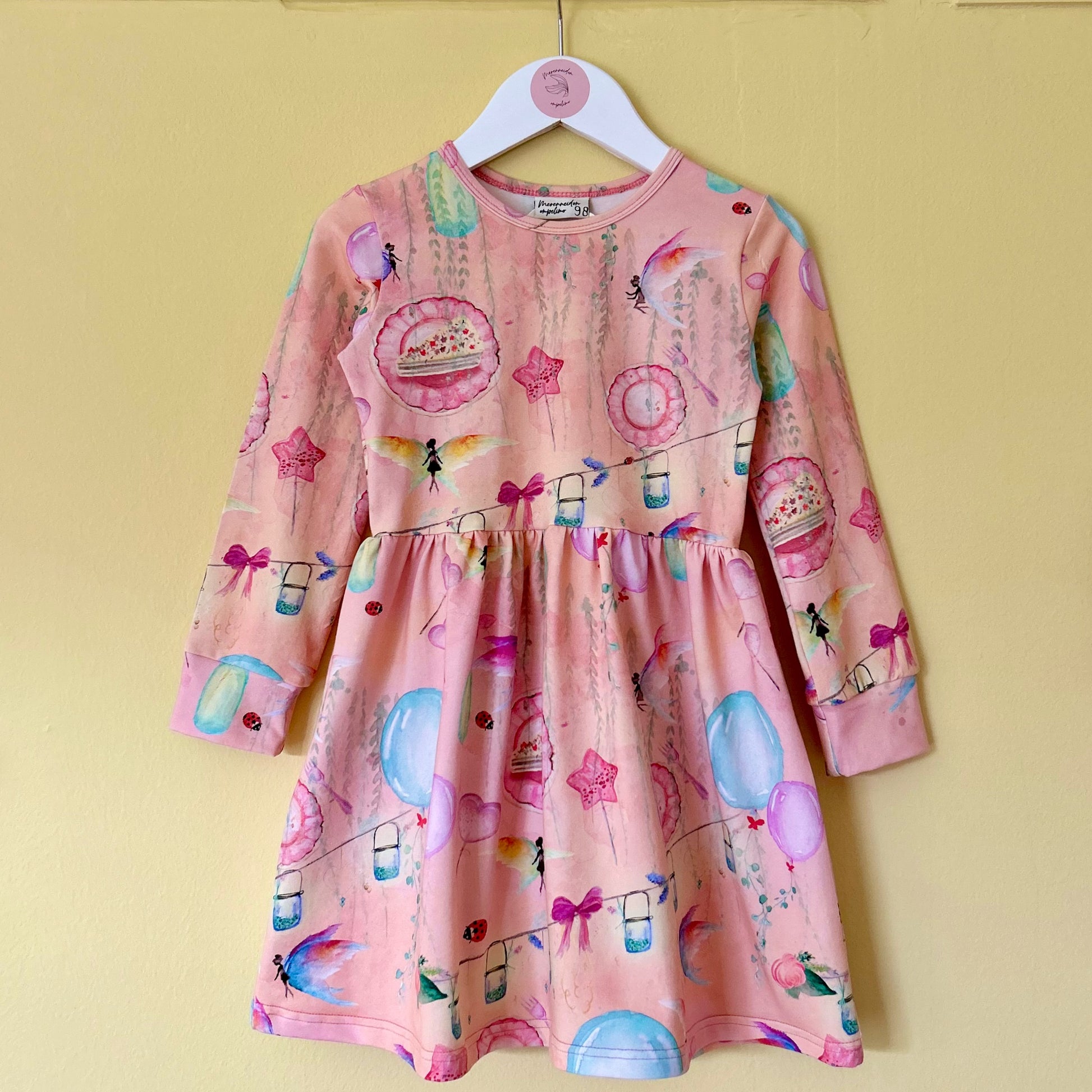 Amanda-mekko Merenneidon omasta Keijusynttärit-kuosista pitkillä hihoilla arkeen ja juhlaan. Koko 98 cm.