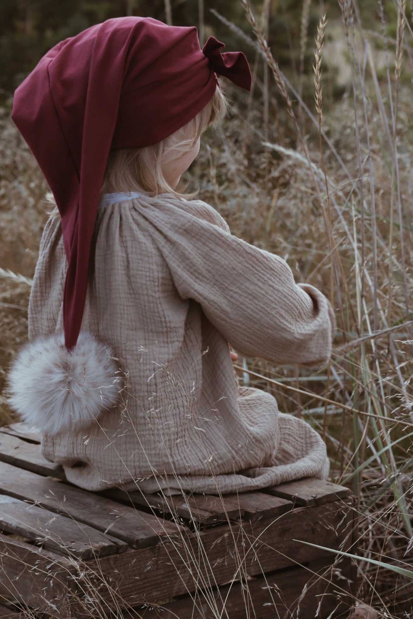 Pehmeän joustava, viininpunainen tonttulakki pitkällä hiipalla. Viimeistele lakki rusetilla ja/tai muhkealla keinokarvatupsulla. Tupsu kiinnittyy nauhoilla lakin sisäpuolelle, ja on irrotettavissa. Tupsun halkaisija noin 10 cm.